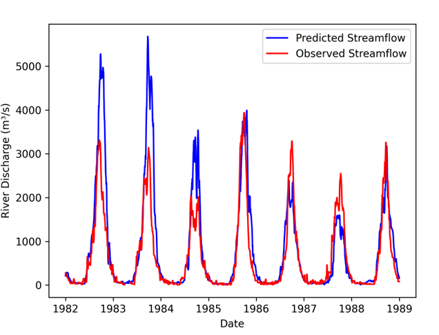Training can take hours depending on GPU and batch size. Evaluation is interactive and lets you choose stations to compare observed vs predicted streamflow. Simulation produces CSV files for each station or coordinate. Note: simulation outputs start after a one-year warmup period; the first 365 days are used as model context and are not written to the output CSVs.
