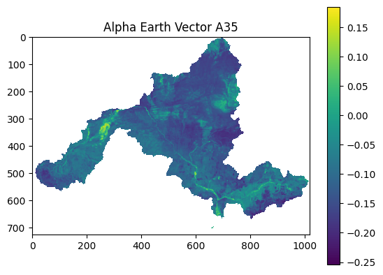Downloads AlphaEarth embedding tiles, clips to the basin, and resamples to the DEM grid.
